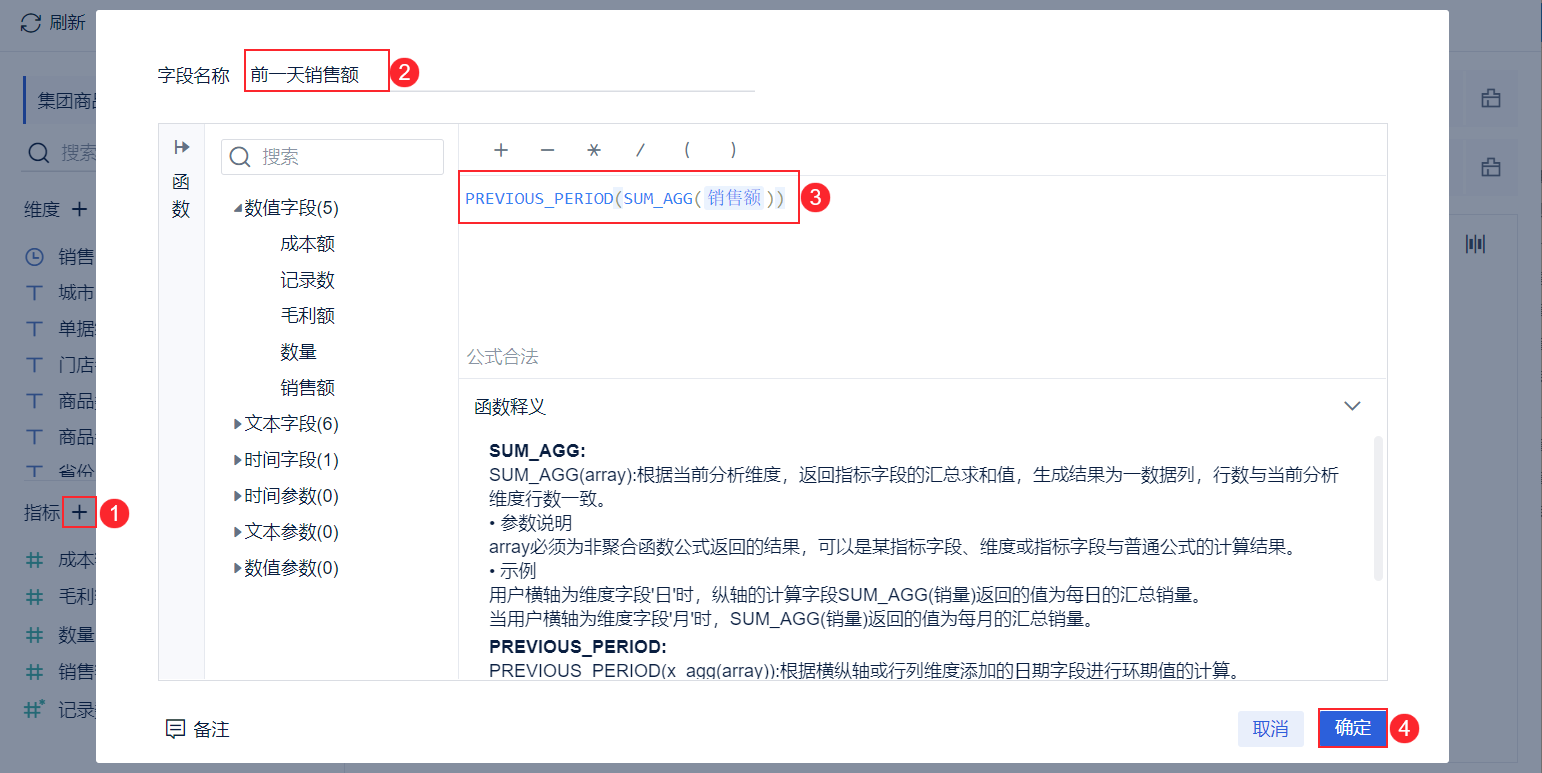 进入组件编辑界面,添加计算字段,命名为「前一天销售额」,输入公式:PREVIOUS_PERIOD(SUM_AGG(销售额)),点击「确定」,如下图所示: