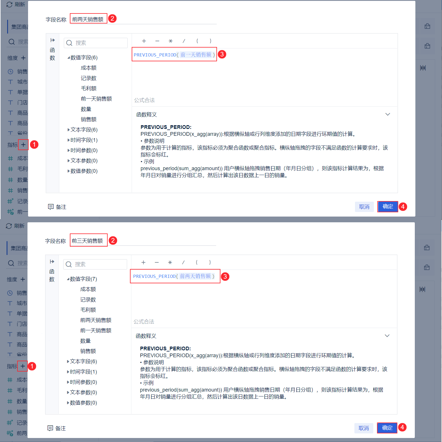 计算「前两天销售额」输入公式:PREVIOUS_PERIOD(前一天销售额)、「前三天销售额」输入公式:PREVIOUS_PERIOD(前两天销售额),如下图所示: