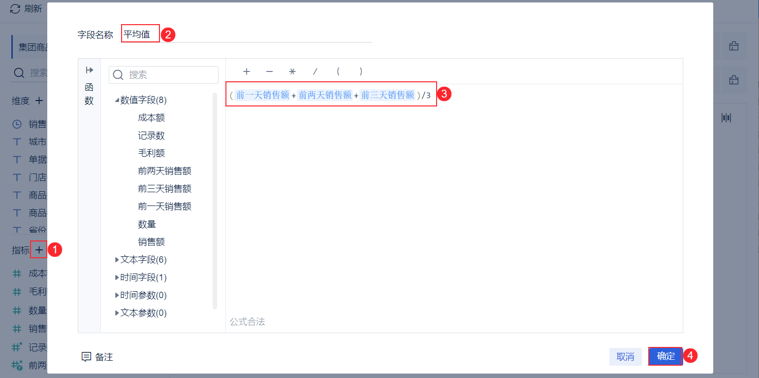 添加计算字段,输入名称「平均值」,输入公式:(前一天销售额+前两天销售额+前三天销售额)/3,点击「确定」,如下图所示: