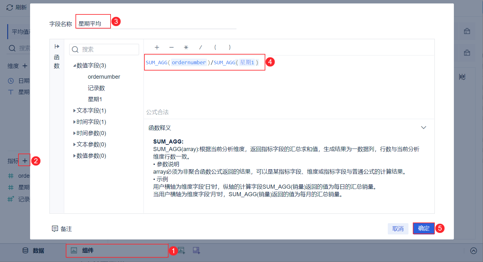 创建组件,进入组件编辑界面,新建计算字段,命名并输入公式:点击「确定」,如下图所示: