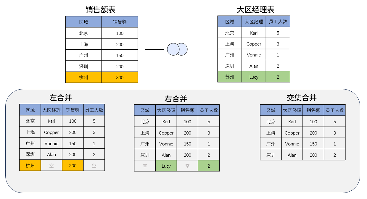 两张表都有对方没有的数据,我们选择左合并、右合并、交集合并、并集合并保留的数据结果都不一样。