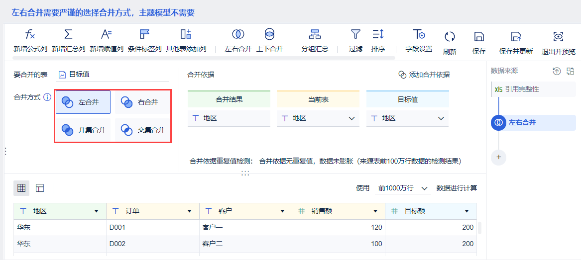 但主题模型无需考虑合并方式,只需建立连线和选择匹配字段即可,系统用更智能的方式保证数据的完整性。