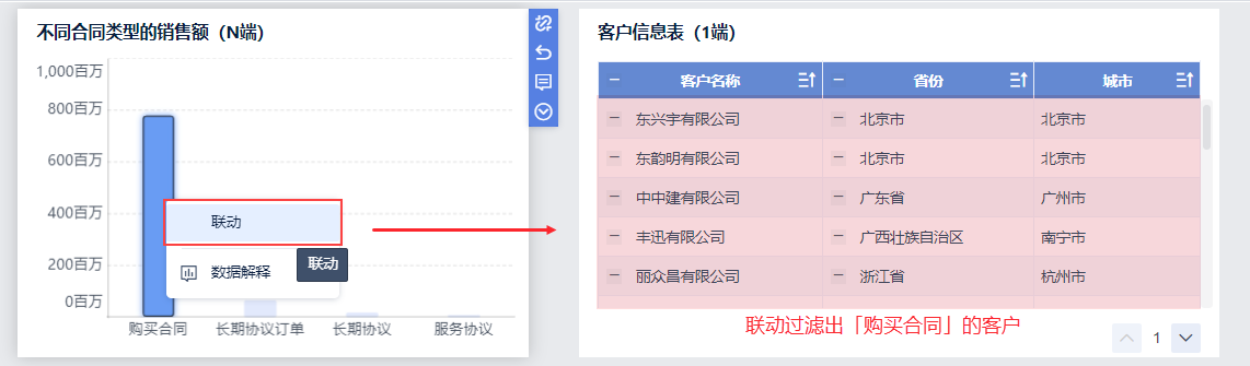 这个时候,如果我们想查看「购买合同」是哪些客户购买的,就需要用到 N 端表对 1 端表联动过滤。点击「购买合同」柱子,过滤出相应的客户。如下图所示: