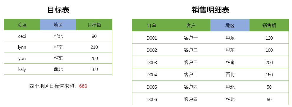 举个简单例子,「目标表」中记录了每个地区的销售目标,「销售明细表」中记录了具体的销售数据。
