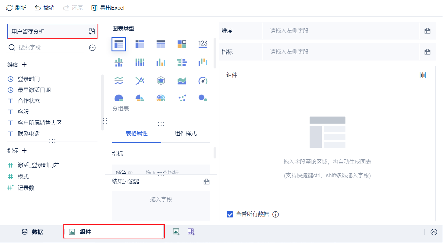 新建分析主题,添加「用户留存分析」数据后,添加组件并进入组件编辑界面。