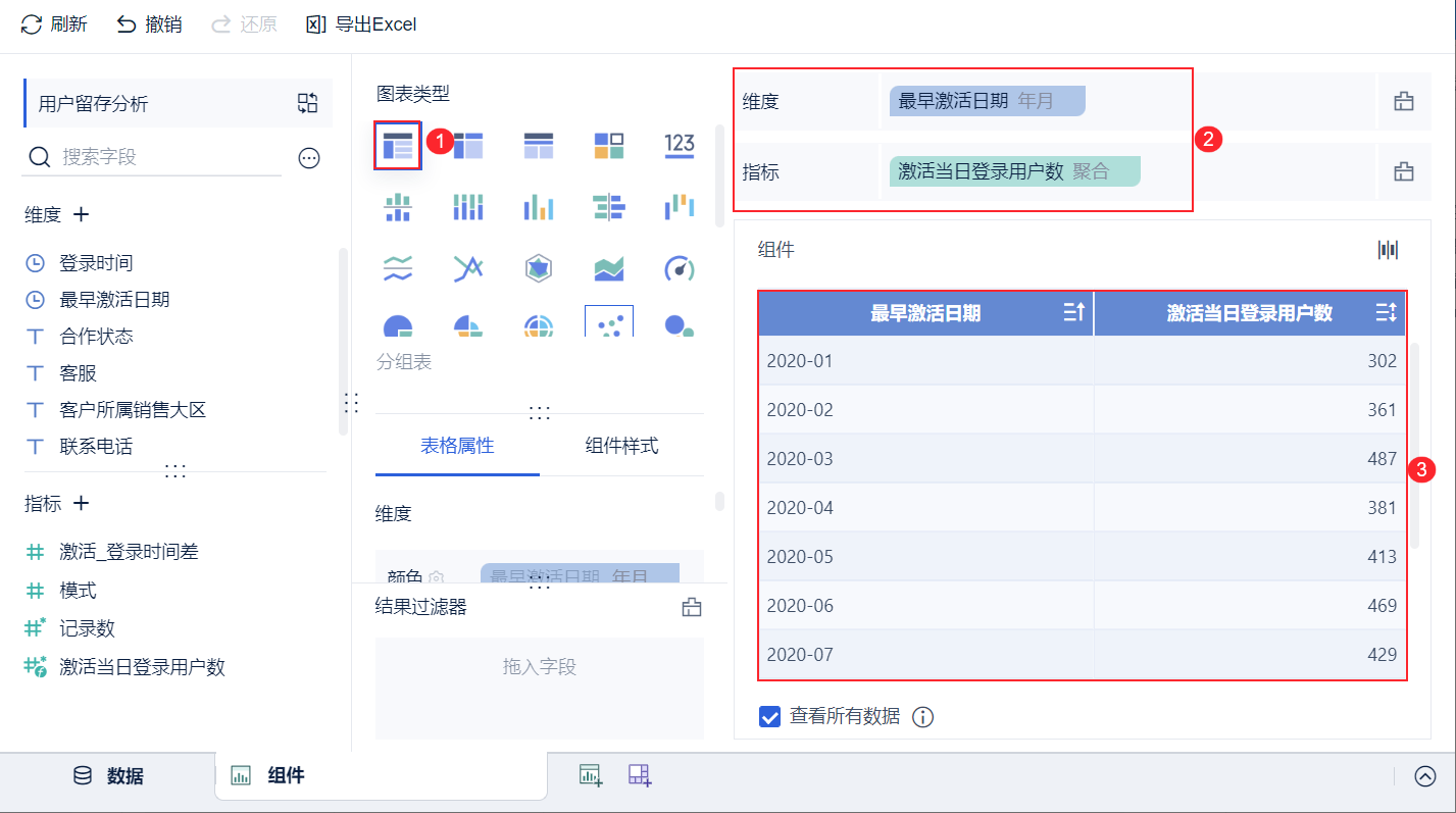 选择分组表,将「最早激活时间」拖入横轴并设置分类为「年月」,将「激活当日登录用户数」字段拖入纵轴,则可以看到激活当天登录用户的数量,如下图所示: