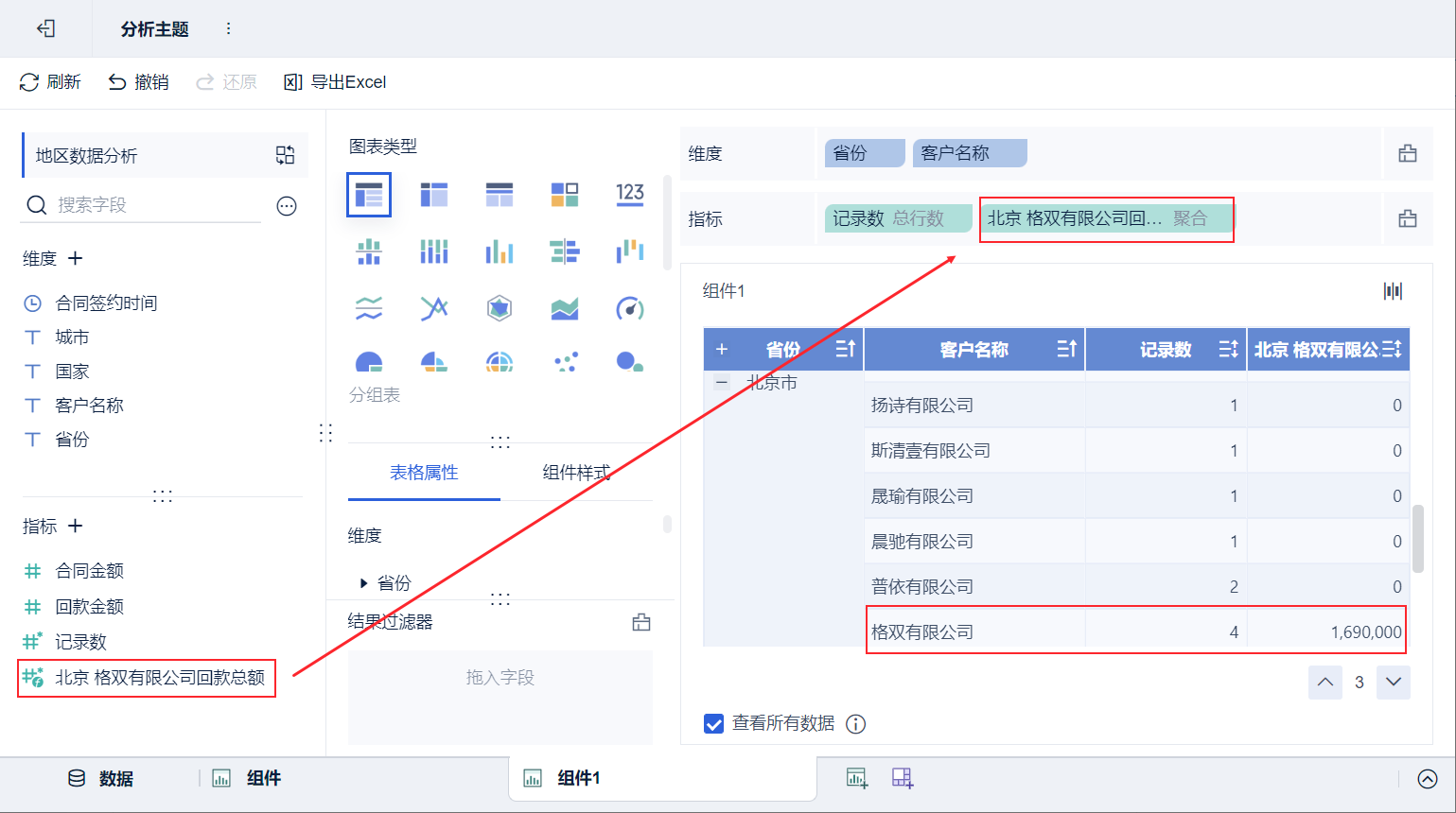添加组件,选择「地区数据分析」数据集,创建「计算字段」,输入字段名称「北京 格双有限公司回款总额」,公式为:SUM_AGG(IF(省份="北京市"&&客户名称="格双有限公司",回款金额,0)),如下图所示: