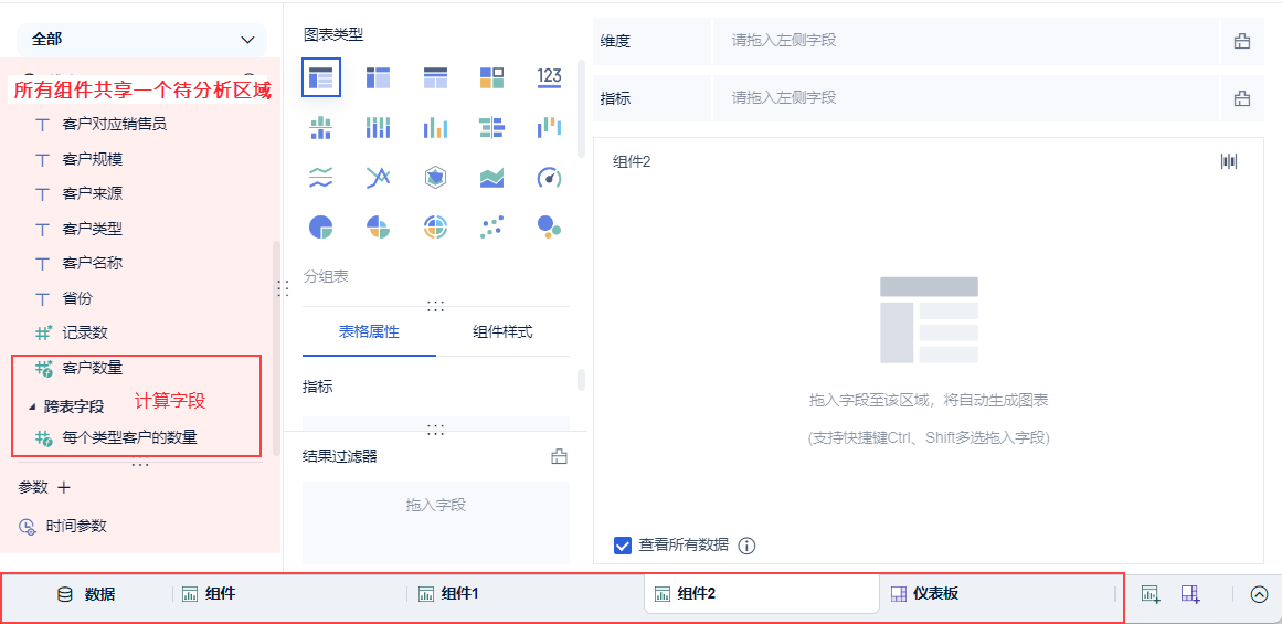 FineBI 5.0 中的组件无法复用其他组件的计算字段,每个组件都需单独创建;
