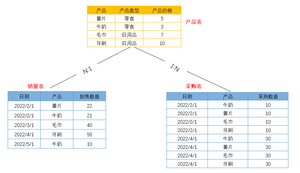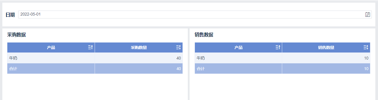 当我们过滤出 2022/5/1 的数据时,发现当时只销售了牛奶。然后我们也发现采购数据表也只剩下了牛奶这个产品,这是为什么呢?