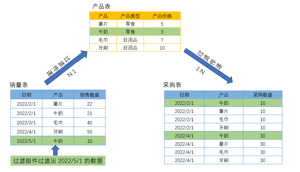 过滤组件过滤后,销量表只剩「牛奶」,如此传递到「产品表、采购表」,导致我们在查看采购数据的时候,只能看到牛奶数据。