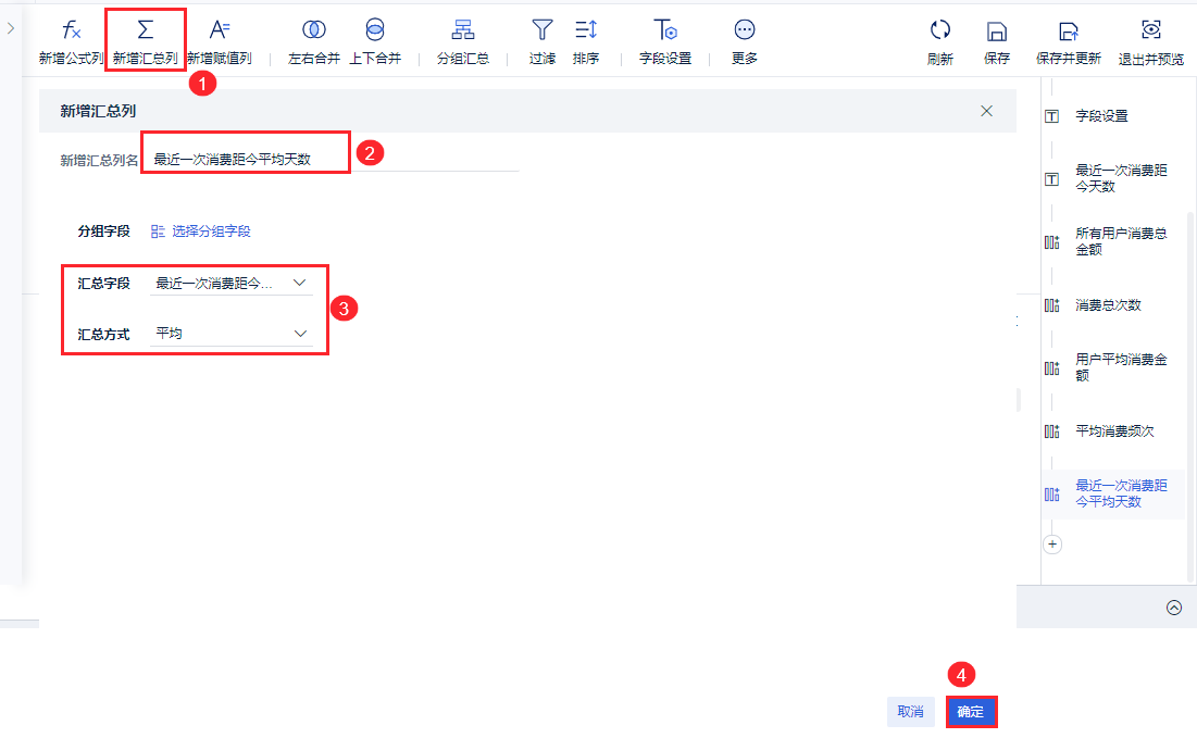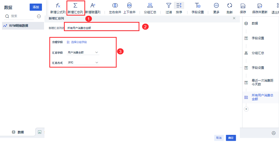 最近一次消费时间(R):「DATE」的汇总方式选择「最晚时间」,可得到每个用户最近一次购买的时间;