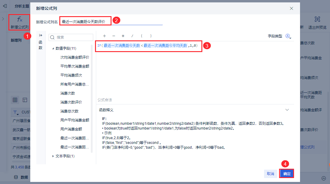 新增公式列「消费次数评价」,当用户消费次数大于用户总体平均值时,标记为 1 ,否则标记为 0 ,公式为IF(消费次数>平均消费频次,1,0)。如下图所示: