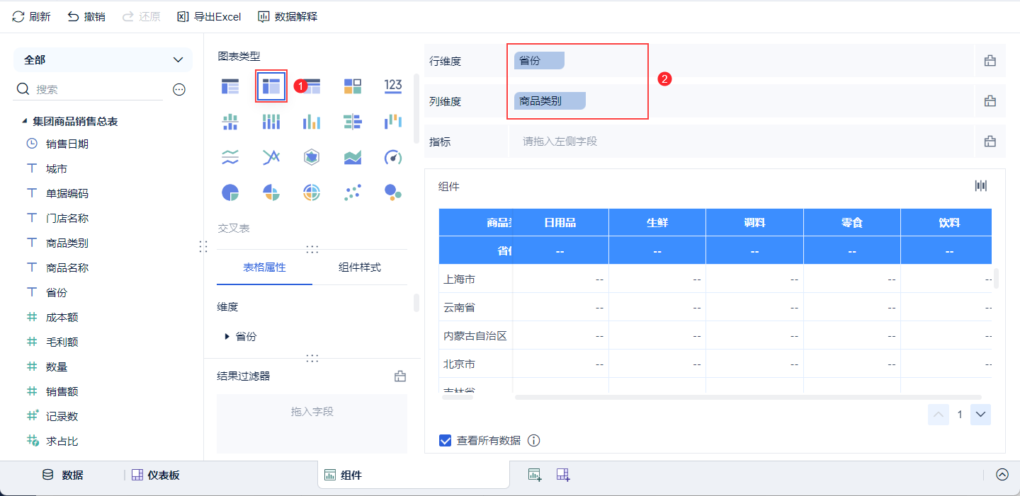 1)进入组件界面,选择图表类型为「交叉表」。并将「省份、商品类别」拖入组件,如下图所示: