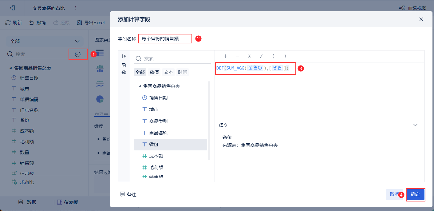 | DEF(SUM_AGG(销售额),[省份,商品类别]) | 按省份、商品类别对数据分组,并对分组后的销售额求和,获得每个省份下不同类别商品的销售额 | DEF(指定维度) |