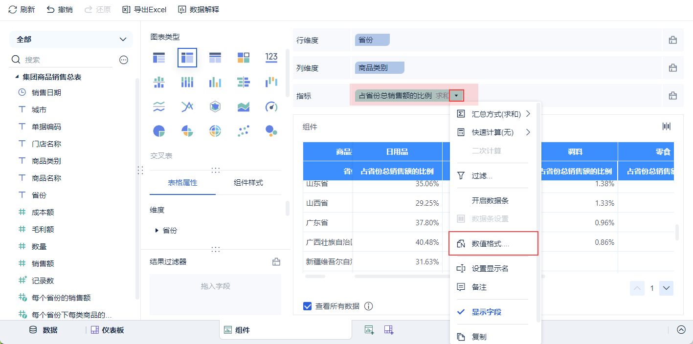5)将「占省份总销售额的比例」拖入到分析区域中,并更改数值格式为百分比,如下图所示: