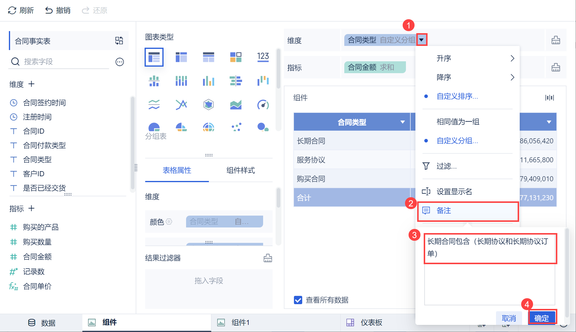 1)选择「合同事实表」创建组件,选择「分组表」,并将「合同类型」拖入维度栏,设置自定义分组,将「长期协议和长期订单协议」合并为一组「长期合同」,如下图所示: