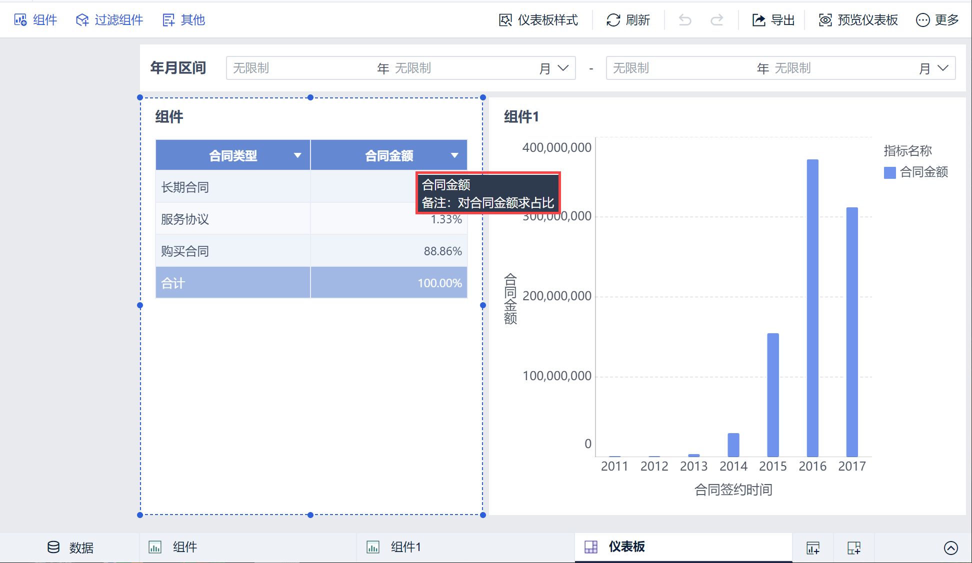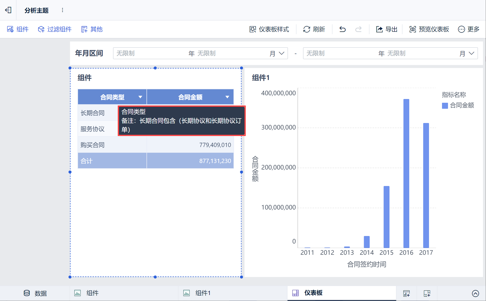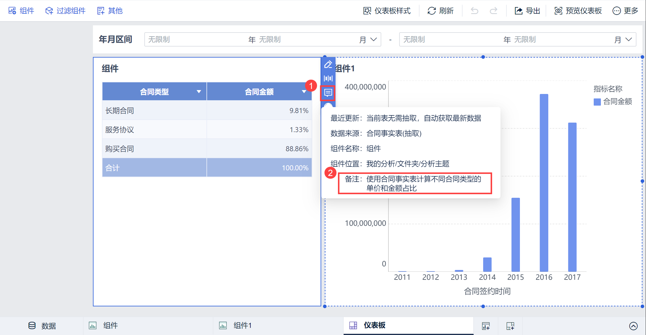 在仪表板编辑和预览界面,鼠标悬浮在已经备注的字段「合同类型」上,即可看到备注,如下图所示: