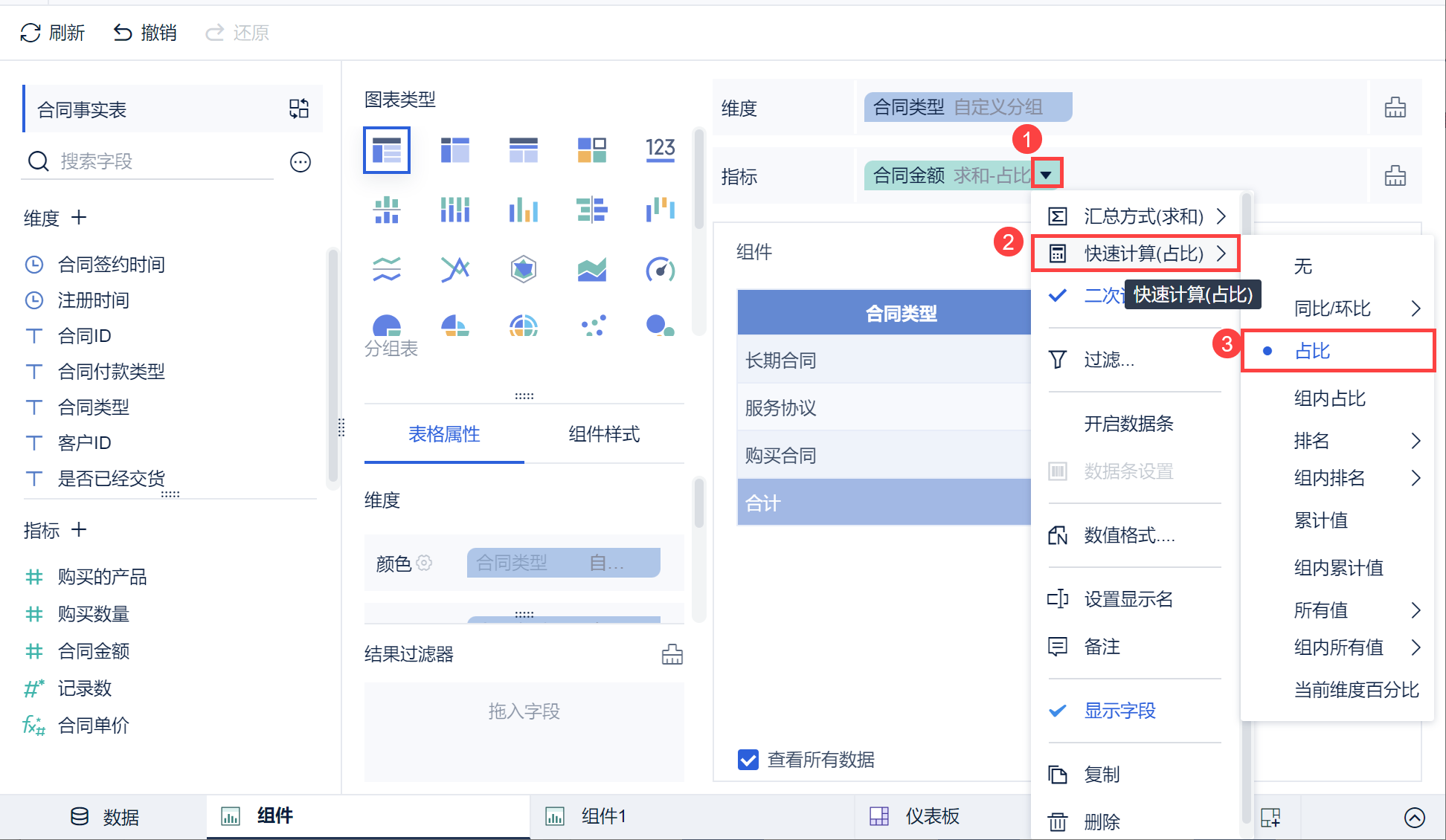 1)将「合同金额」拖入指标栏,点击下拉>快速计算>占比,计算不同合同金额类型占比,如下图所示: