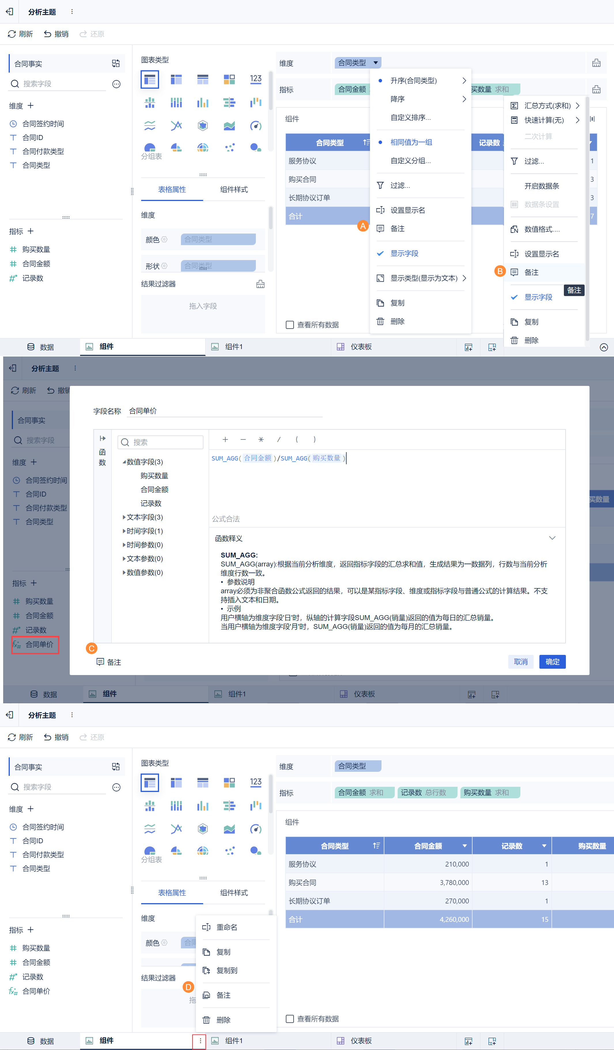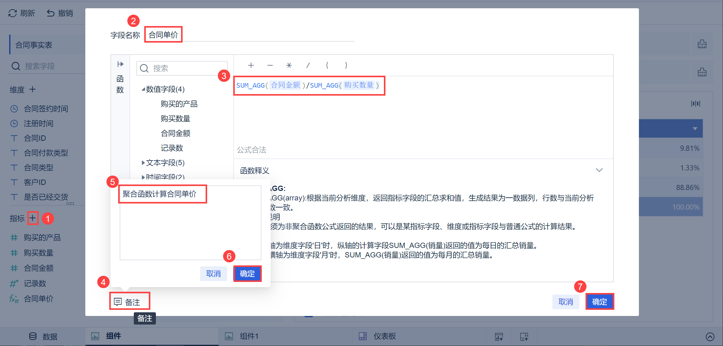 然后再计算合同单价,点击「+」添加计算字段,命名为「合同单价」,输入公式:SUM_AGG(合同金额)/SUM_AGG(购买数量),点击左下角的「备注」,增加说明: