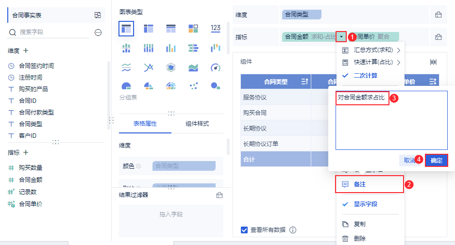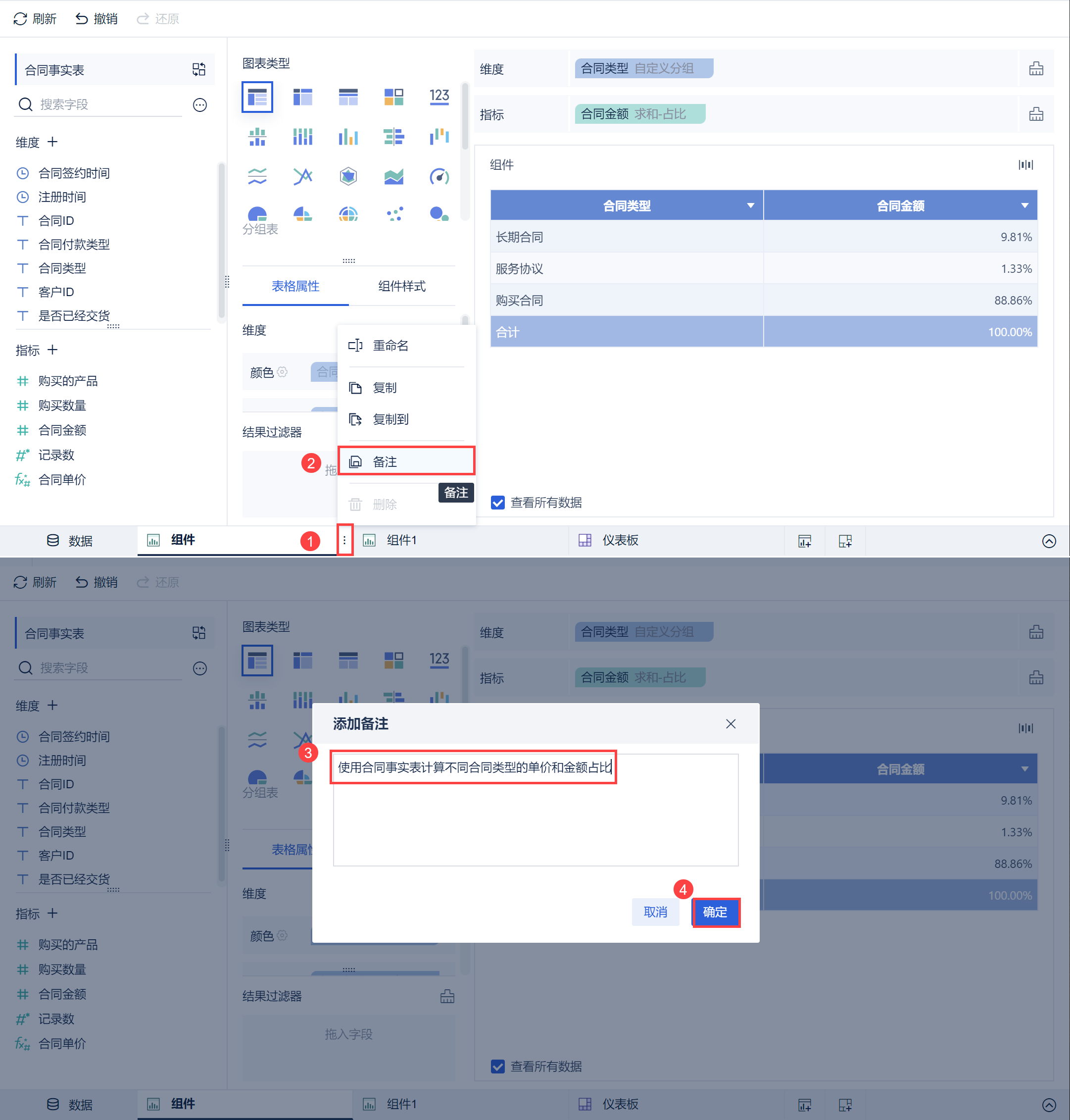 使用「合同事实表」制作好组件,选中组件,点击「备注」并输入备注:使用合同事实表计算不同合同类型的单价和金额占比,点击「确定」,如下图所示:
