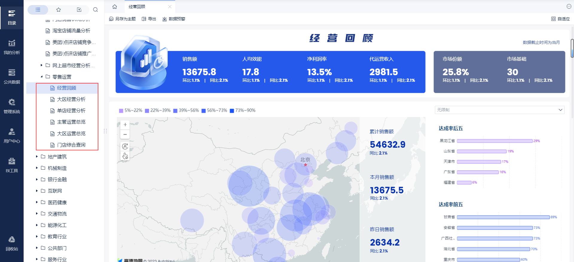 从 整体、大区、主管、店铺 等多角度对公司运营数据进行监控和分析,把握经营情况。