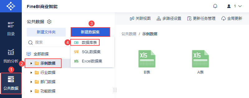 1)管理员登录FineBI系统,点击「公共数据」,选择任意文件夹,点击「新建数据集>数据库表」,如下图所示: