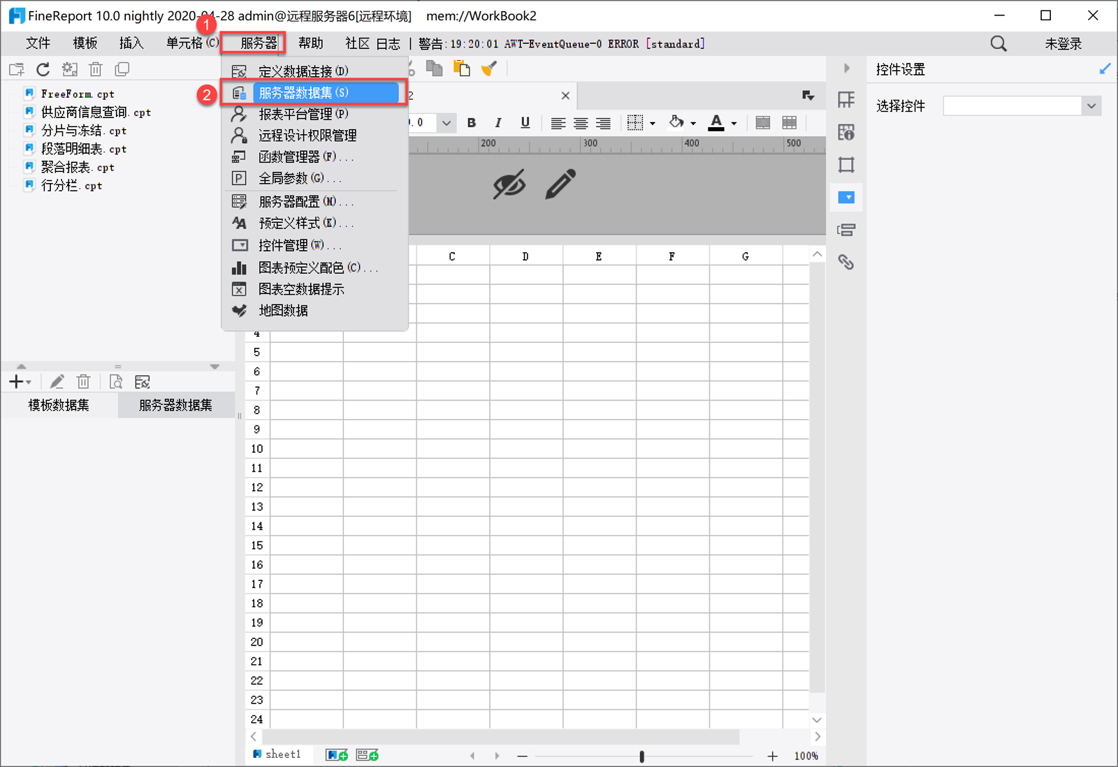 1)打开设计器,选择「服务器>服务器数据集」,如下图所示: