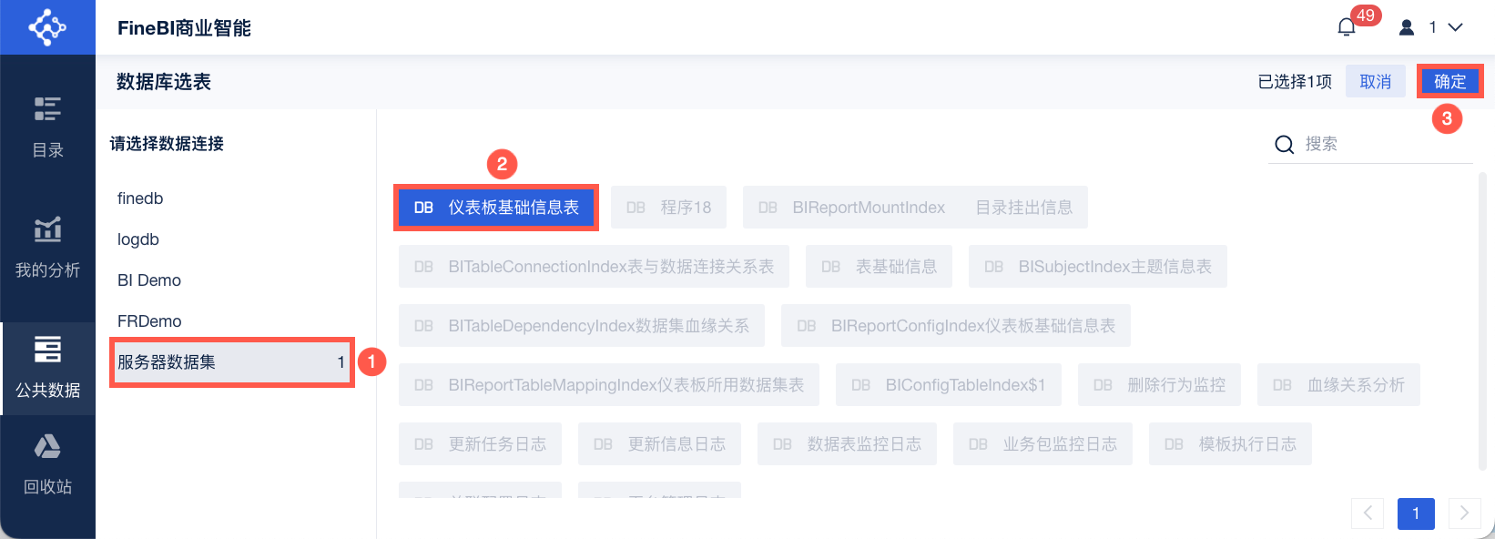 2)在服务器数据集下,可以看到刚刚在设计器中添加的程序4,选中表并点击「确定」添加到业务包中即可使用。如下图所示: