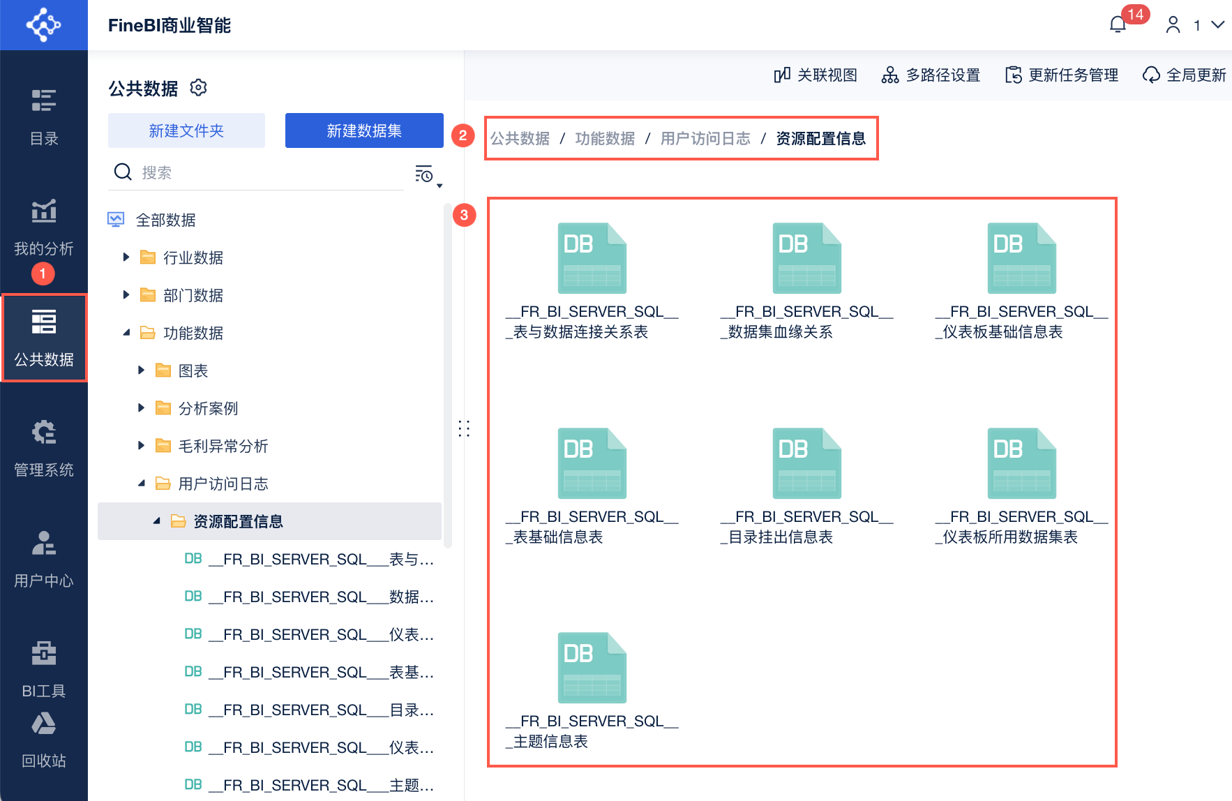 6.0.10 及之后版本的新工程,系统配置数据集已全部内置在「公共数据>功能数据>用户访问日志>资源配置信息」文件夹下,无需额外操作,可直接使用。