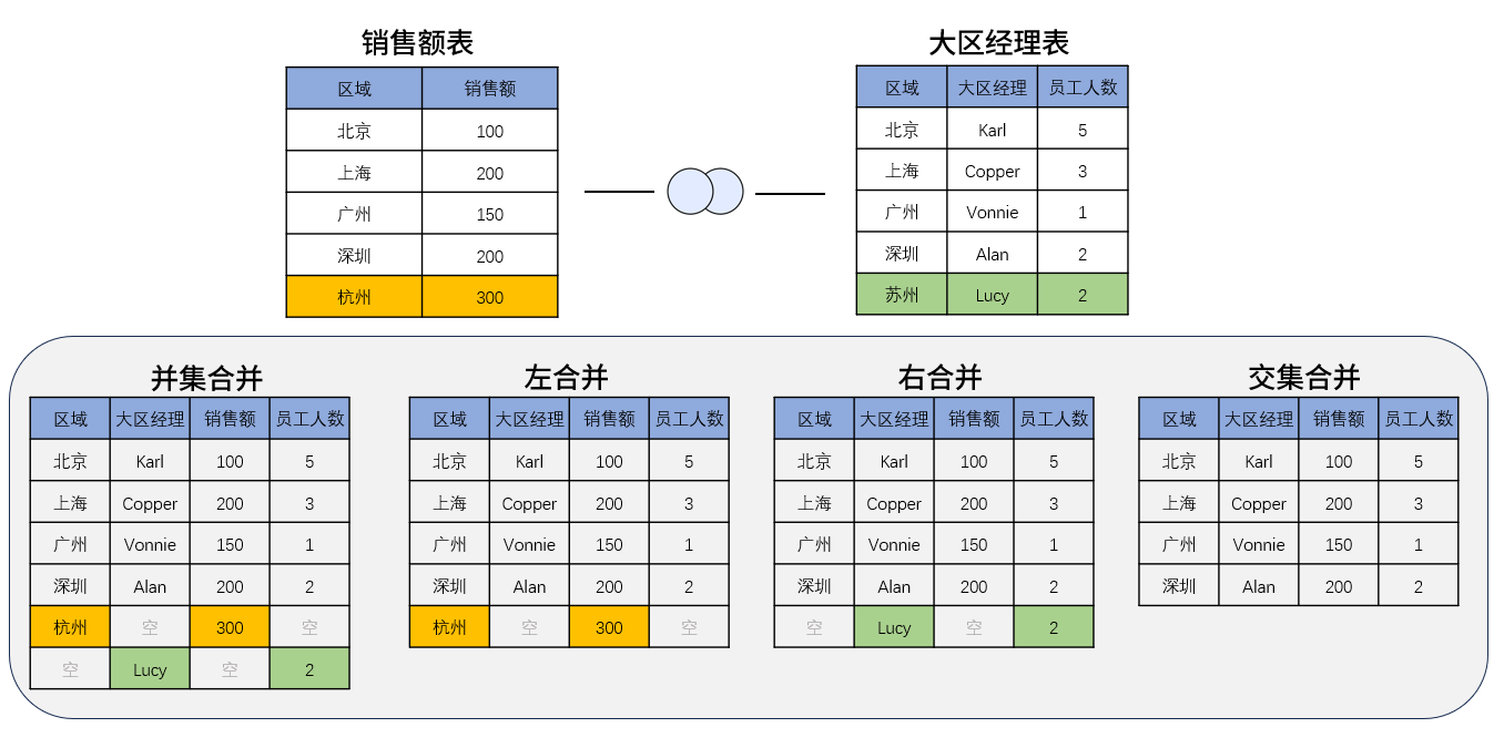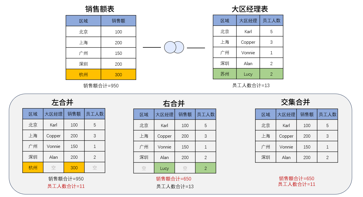 两张表都有对方没有的数据,我们选择左合并、右合并、交集合并、并集合并保留的数据结果都不一样。