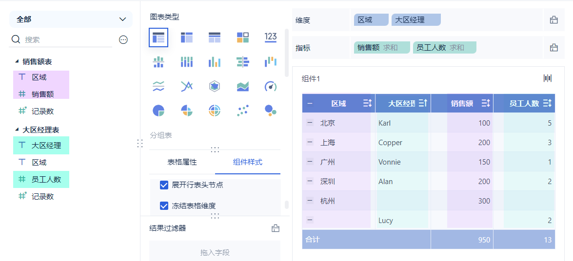 例如:在组件中只使用了「销售额表」和「大区经理表」的维度字段,所以这两张表取交集。