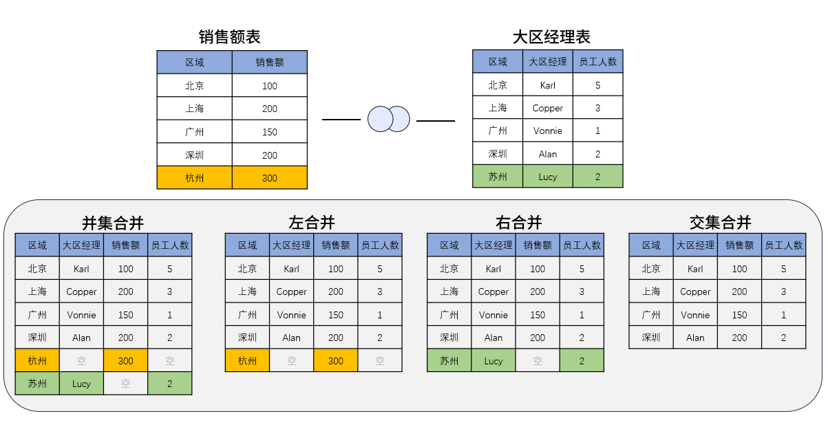 两张表都有对方没有的数据,我们选择左合并、右合并、交集合并、并集合并保留的数据结果都不一样。