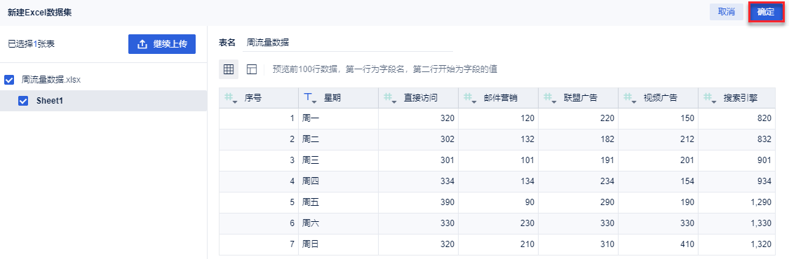 2)点击「本地Excel文件>上传数据」,上传表数据。如下图所示: