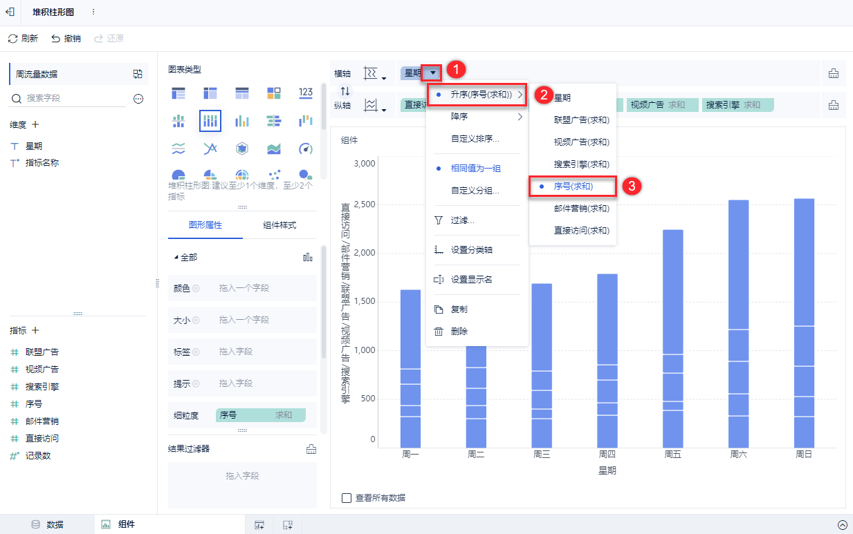 2)鼠标悬浮在横轴上的「星期」字段上,点击右侧倒三角符号,选择「升序>序号(求和)」。如下图所示:
