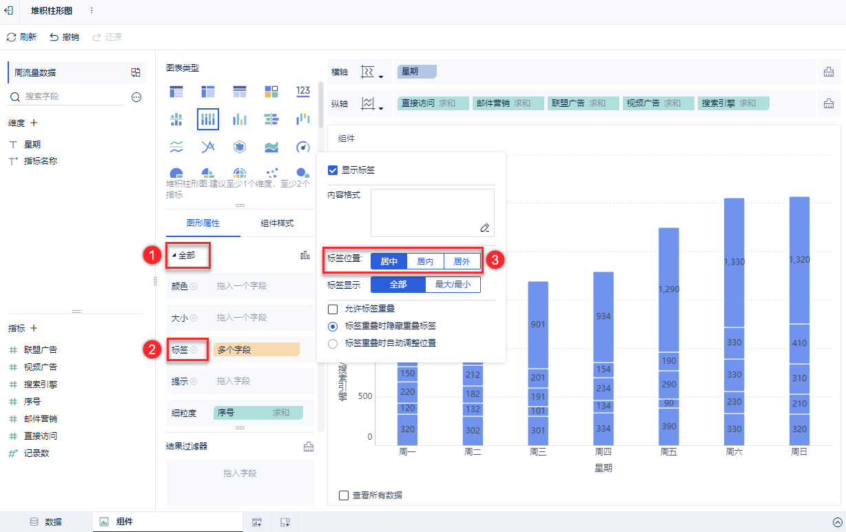 1)将指标字段「直接访问、邮件营销、联盟广告、视频广告、搜索引擎」指标依次拖入图形属性中与它们名称相同的下拉栏的「标签」中。如下图所示: