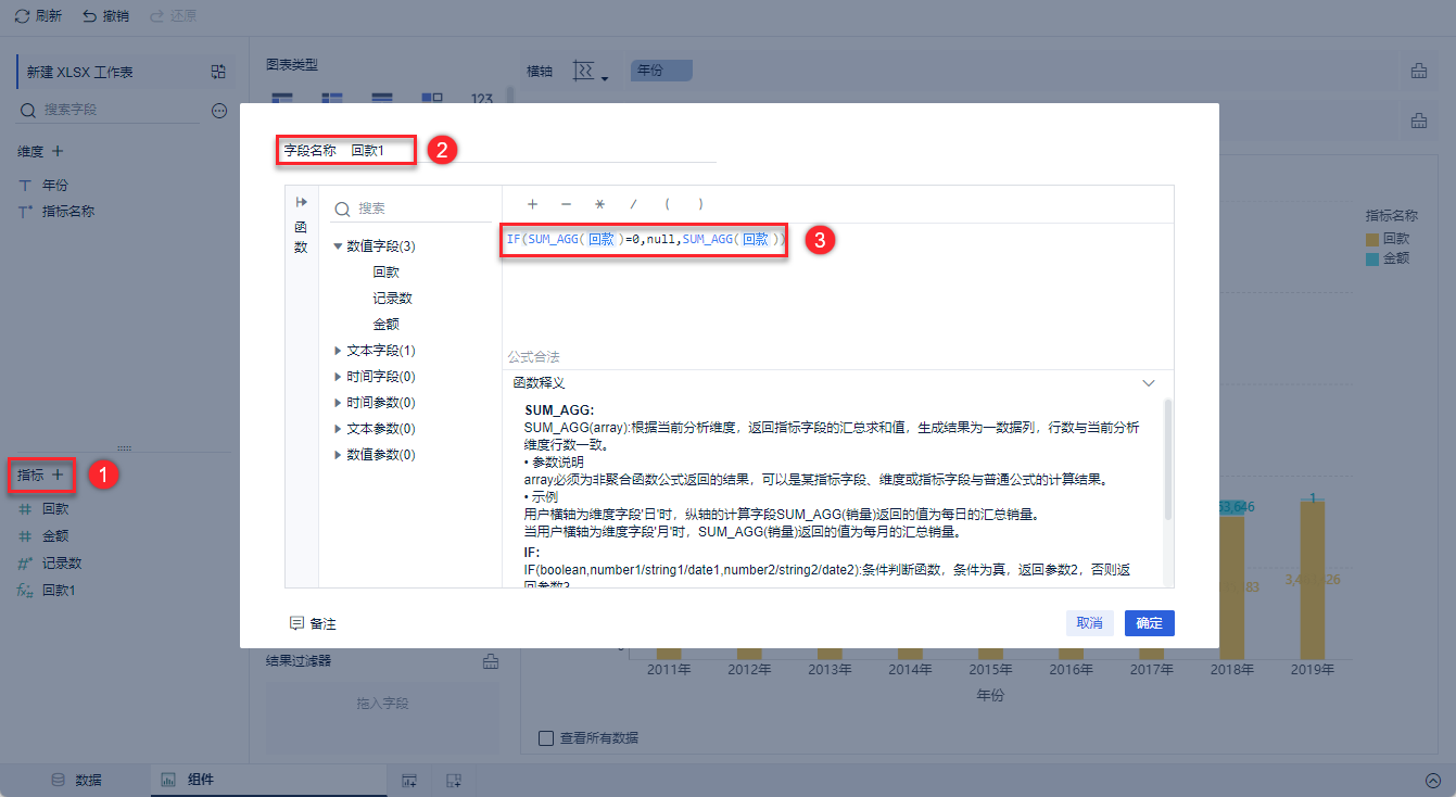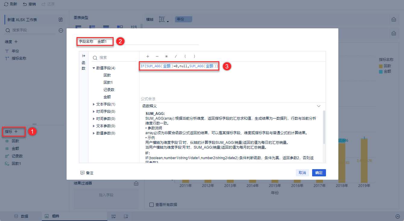| 金额1 | IF(SUM_AGG(金额)=0,null,SUM_AGG(金额)) | 如果「金额」为 0,则为 null ,否则为原数值 |