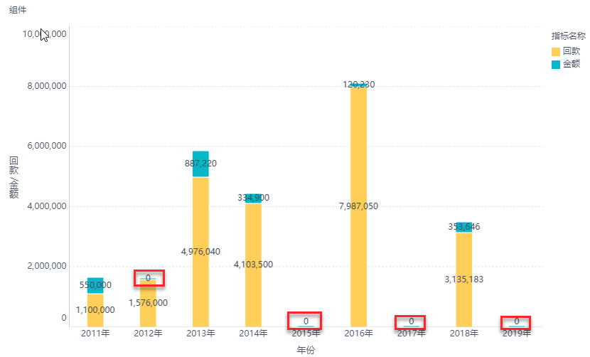 若出现指标为 0 的情况,在堆积柱形图中也会显示,如下图所示:
