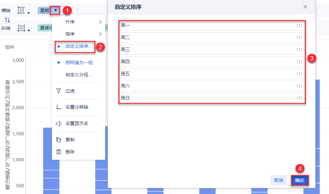 1)鼠标悬浮在横轴上的「星期」字段上,点击右侧倒三角符号,设置自定义排序。如下图所示: