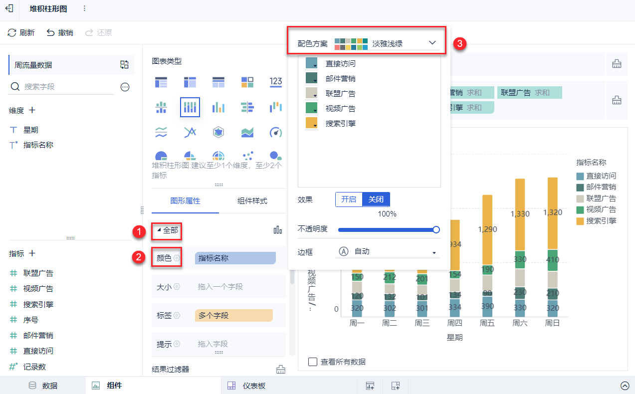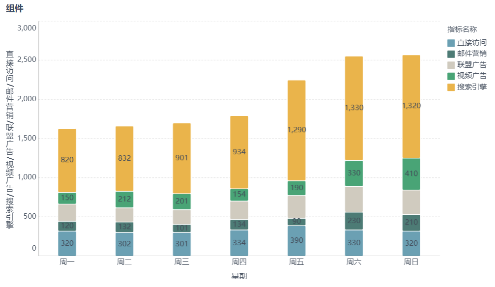 将「星期」字段拖入维度栏中,将指标下的字段「直接访问、邮件营销、联盟广告、视频广告、搜索引擎」按顺序置入指标栏中,在图表类型下选择「堆积柱形图」。如下图所示:
