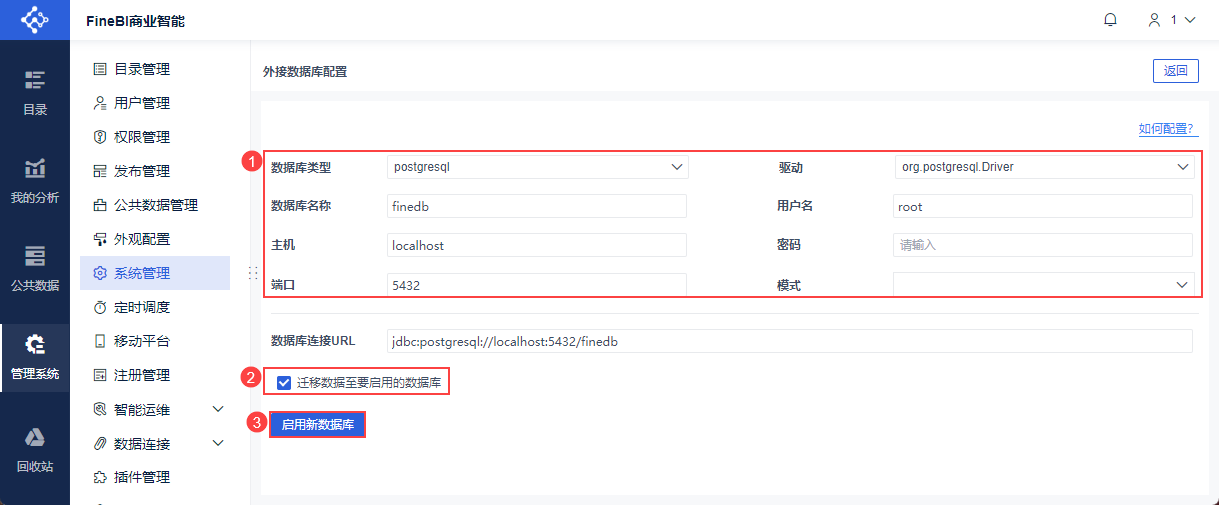 点击「启用新数据库」后,会将原 finedb 数据库的平台数据迁移到新外接数据库中。
