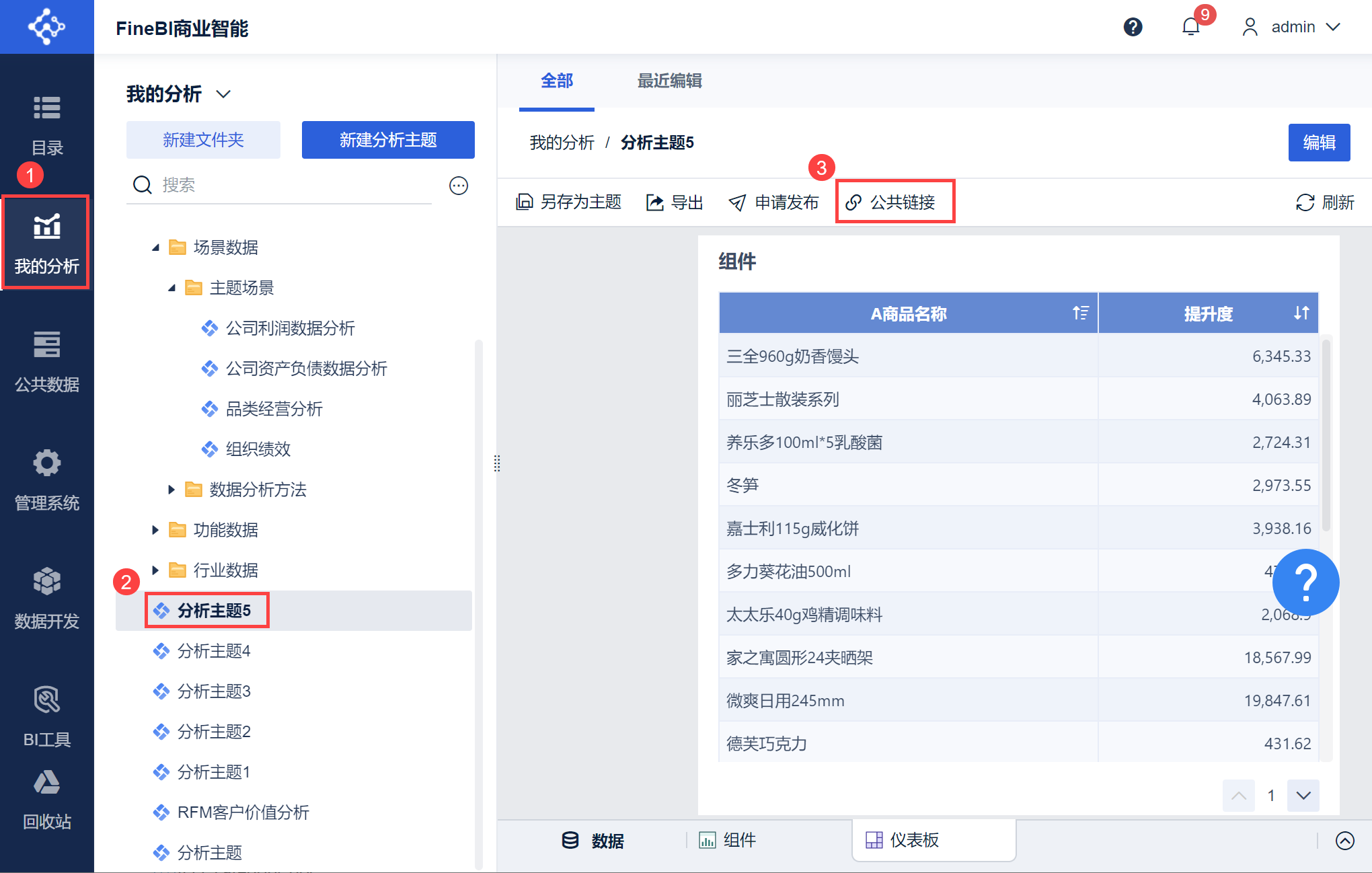 注:公共链接功能让所有用户都能将自己创建的仪表板公开,此行为可能会导致内部数据外泄,所以 FineBI 只有在管理员给普通用户打开公共链接的分享权限后,普通用户才能通过公共链接分享仪表板。