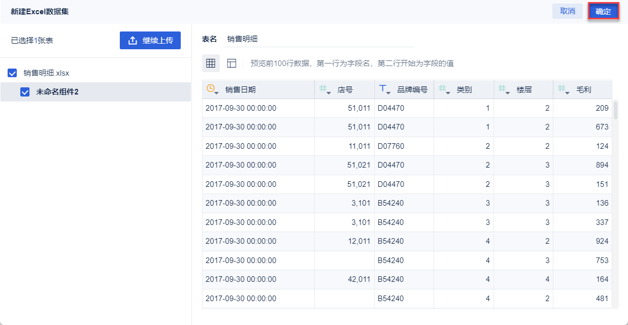 2)点击「本地Excel文件>上传数据」,上传表数据。如下图所示: