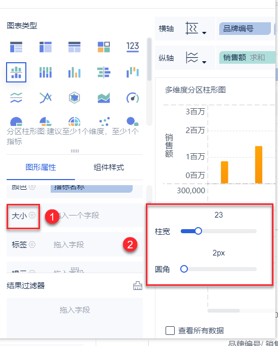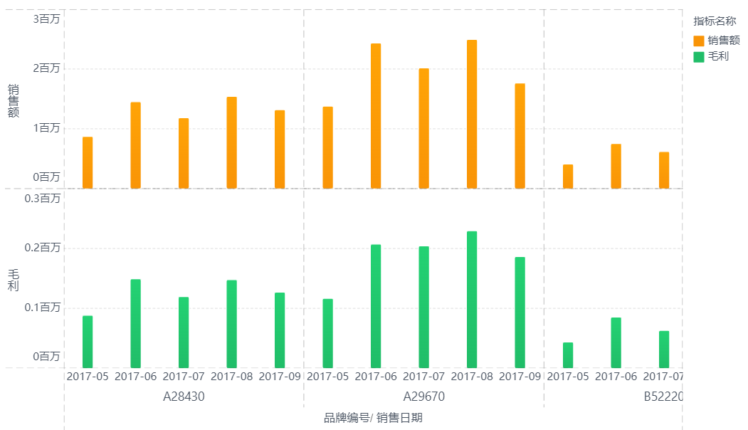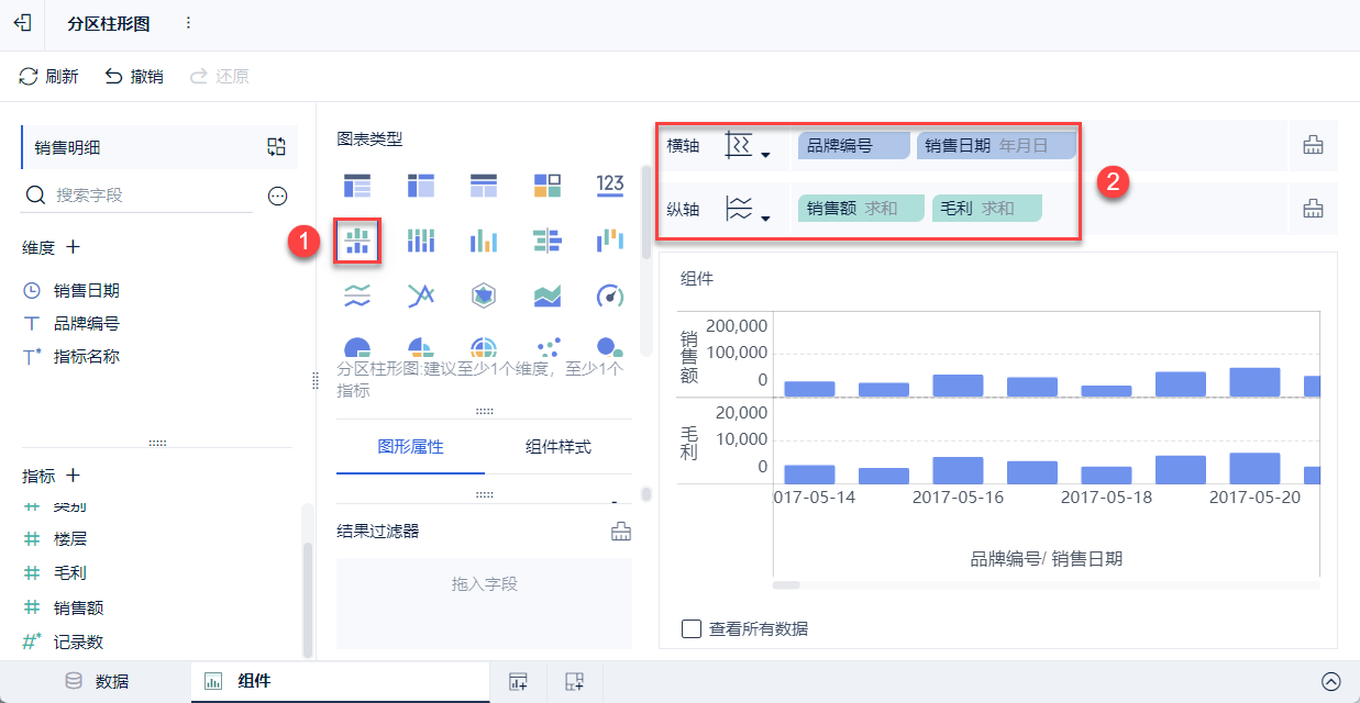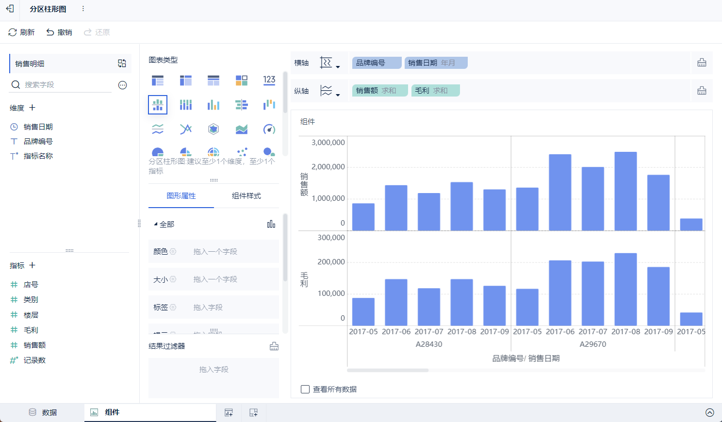 3)在图表类型下选择「分区柱形图」,将「品牌编号」、「销售日期」字段拖入到横轴中,「销售额」、「毛利」字段拖入到纵轴中。如下图所示: