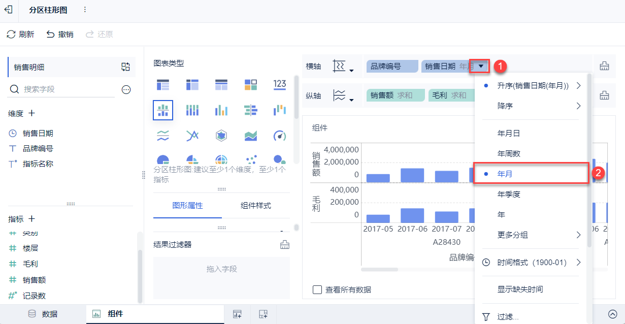 4)点击销售日期(年月日)字段下拉框,选择年月,完成后的图表如下所示:
