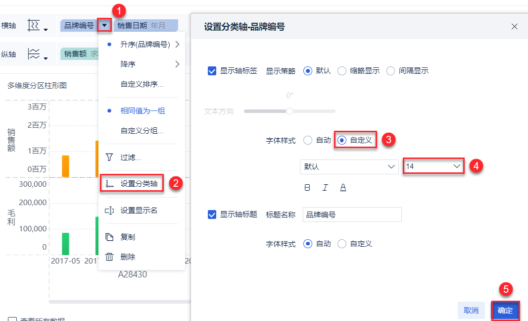 1)点击品牌编号字段下拉框,选择设置分类轴,在轴标签下选择字体样式自定义,设置字体号为14,点击确定,如下图所示: