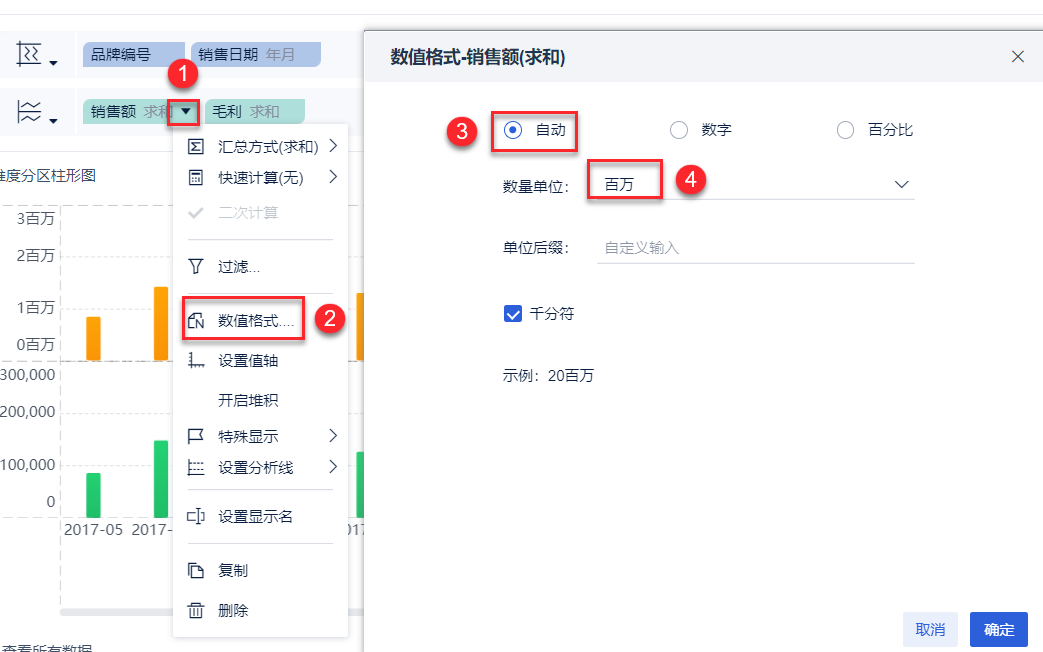 2)分别在销售额(求和)和毛利(求和)字段下点击下拉,选择数值格式,点击数量单位百万,点击确定,如下图所示: