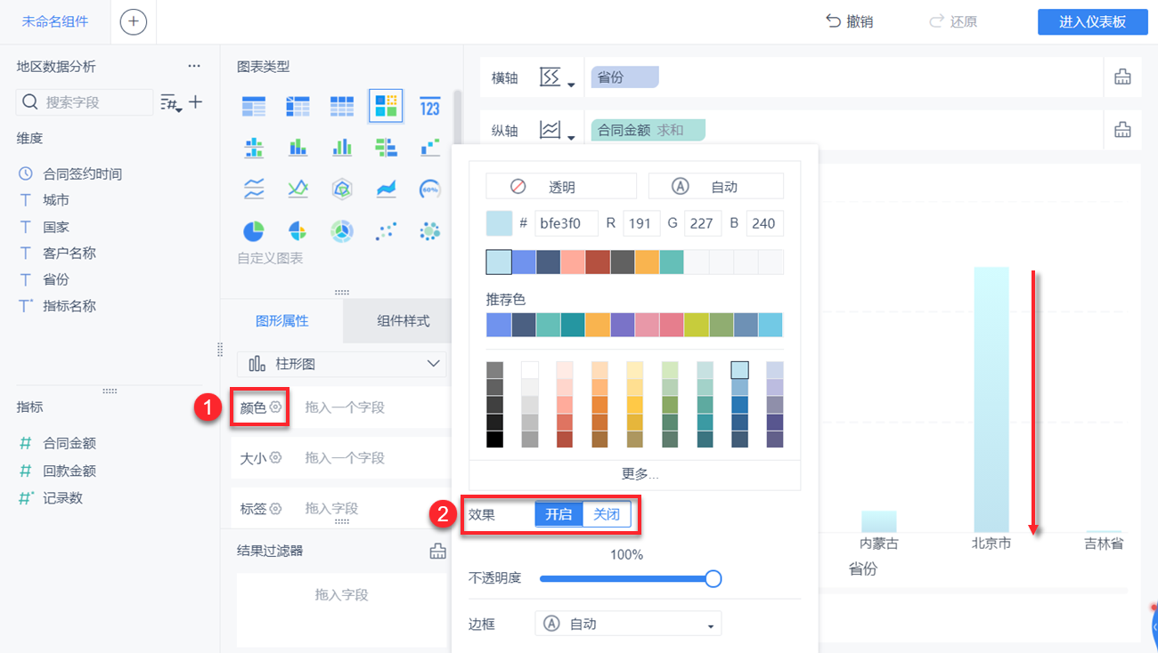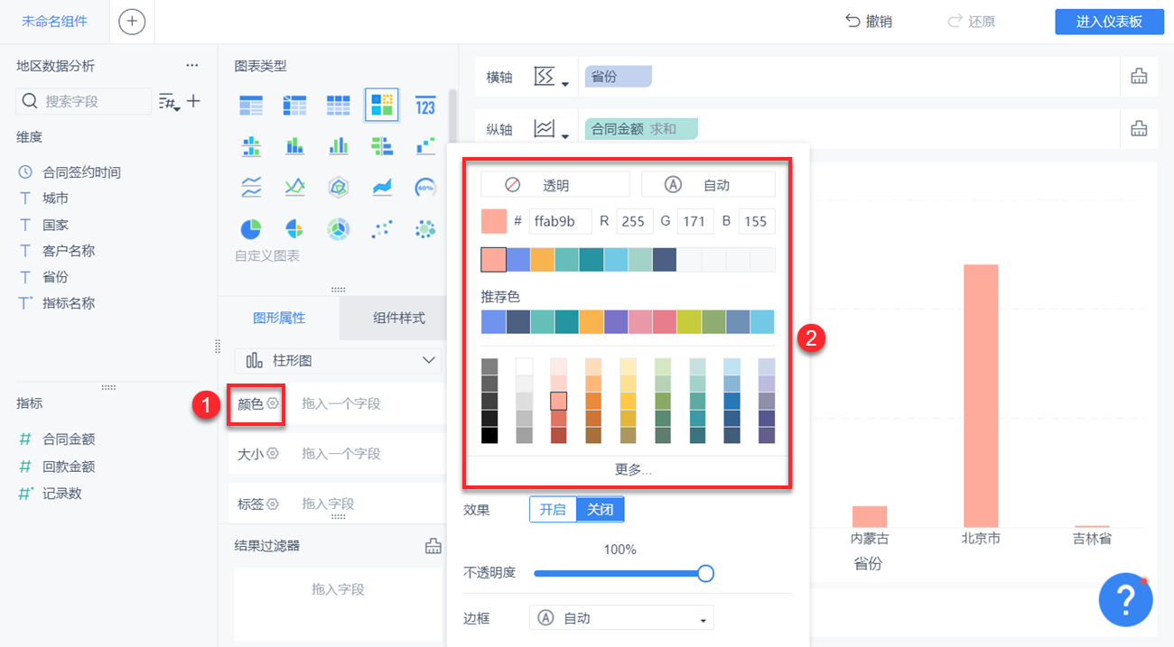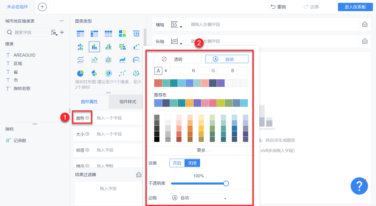 用户创建图表组件时,可在「图形属性」下点击「颜色」栏,为图表组件设置颜色。如下图所示: