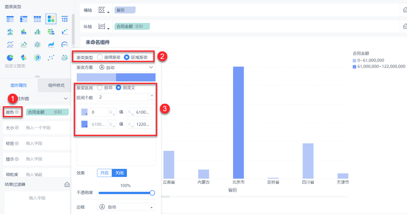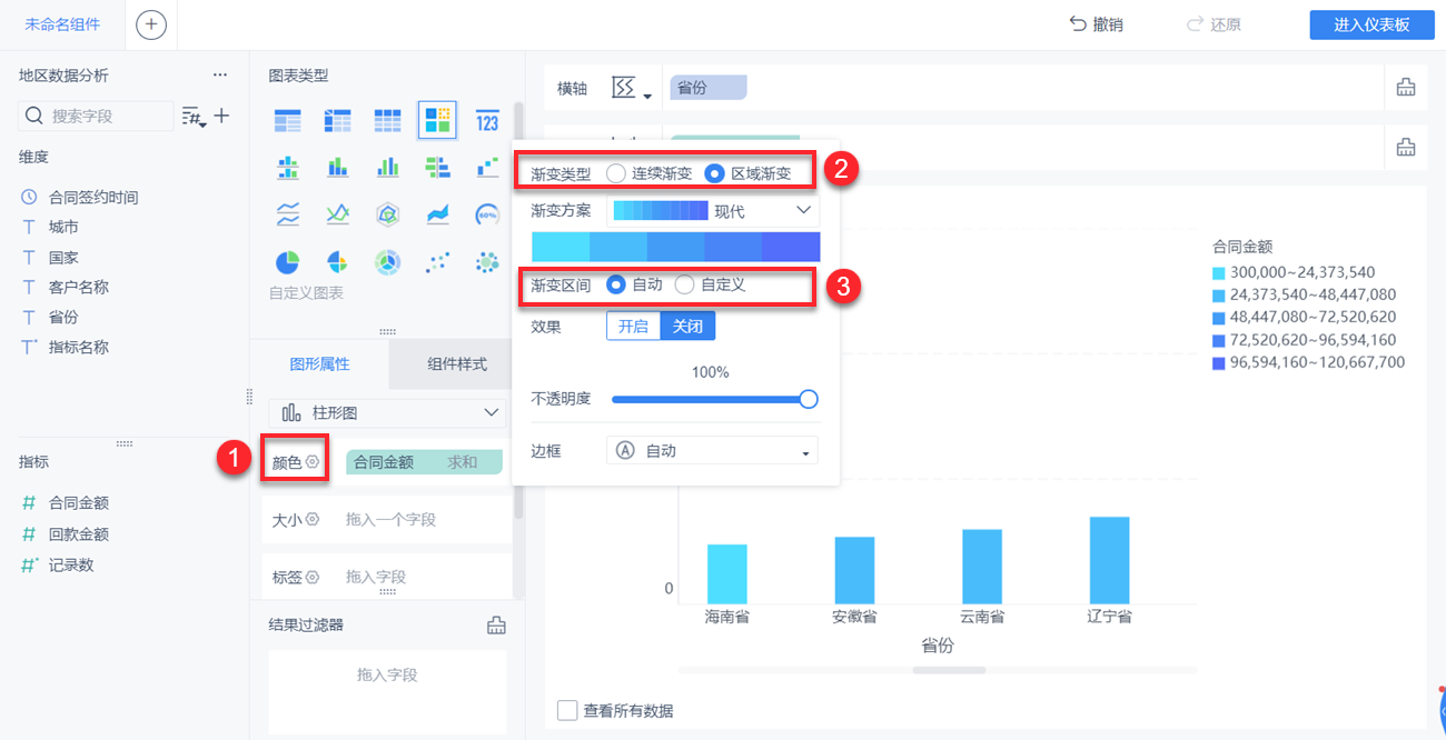 颜色栏拖入指标字段,渐变类型选择「连续渐变」或者「区域渐变」,渐变区间选择「自动」。如下图所示: