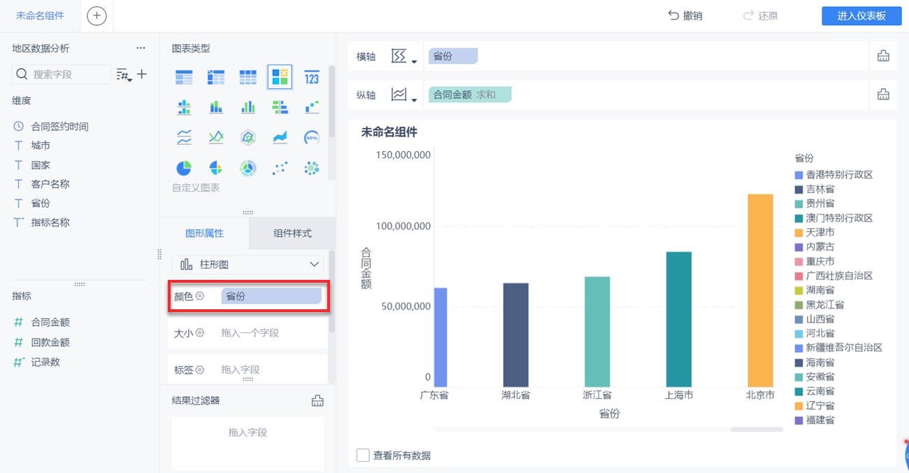 使用颜色区分「省份」的柱子,可以将维度字段「省份」拖入颜色栏。每个省份颜色不同,同时图表右侧自动生成图例。如下图所示: