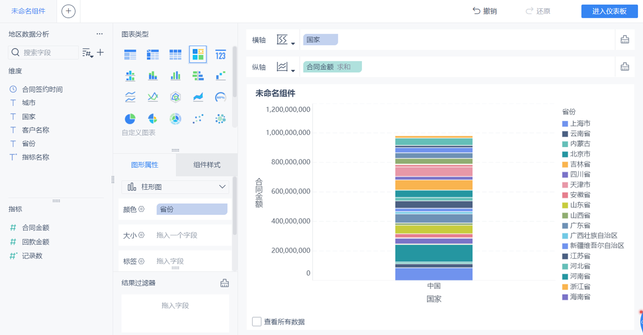 将「省份」拖入颜色栏,点击纵轴字段「合同金额」右下角的「开启堆积」按钮,则可以将中国的合同金额按照省份堆积起来。如下图所示: